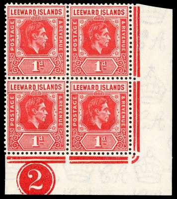 1942 (Nov.) 1d scarlet lower right Plate block of four, R10/5 RP serrated edge. Fine o.g., lightly hinged on the selvedge only. Ex Harold Green. SG 99b, £180