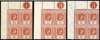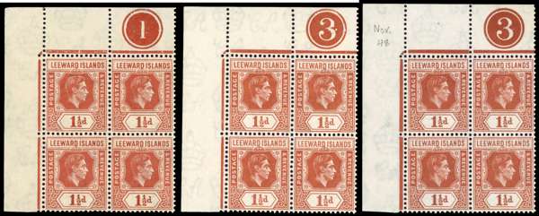 1938, 1942 (Mar.) and 1948 (Nov.) 1½d top left Plate blocks of four. 1938 (Plate 1) prior to R1/1 damage to ‘L’; 1942 showing a hand-painted retouch (this printing seems to have had every example of the flaw painted in), and 1948 showing the repaired letter. Unmounted o.g., a fine group, ex Harold Green. SG 101 var