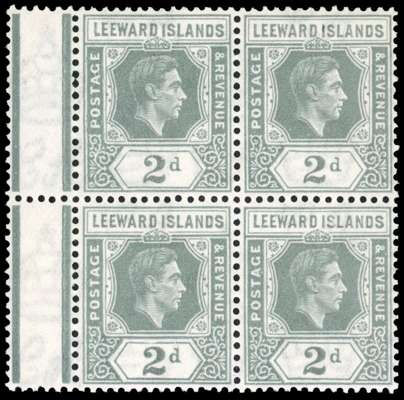 1942 (Aug.) printing of the 2d grey interpanneau-marginal block of four, top right stamp with R9/2 short ‘I’ showing a handpainted repair. Other varieties include large value tablet dent on R10/1, and the sliced base of the first ‘L’ on R9/1 confirms the printing. SG 103b var
