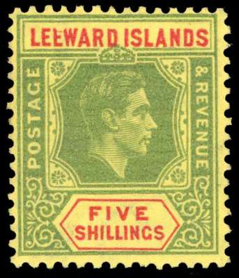 1943-4 5/- green and red on yellow ordinary paper, R4/3 LP broken ‘E’, o.g. which is in part slightly glazed; thinned. SG 112ba, £1200