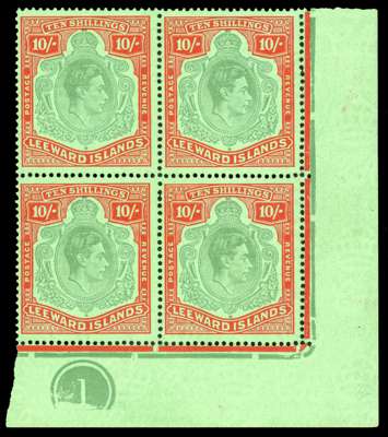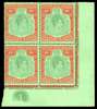 1944 (Dec.) 10/- deep green and deep vermilion on green paper with emerald back Plate block of four, unmounted o.g., a little foxing on reverse of selvedge. SG 113c