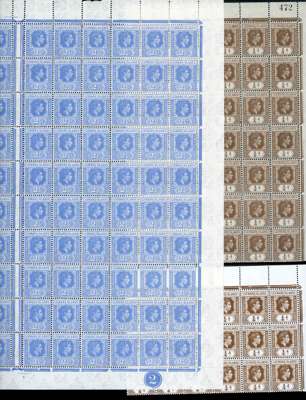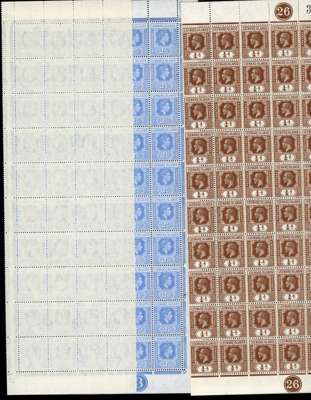 KG VI multiples with ¼d sheets on chalky paper (2, one split) and ordinary paper Plate 3 sheet, Plate 2 block of 100 and two further blocks; 2½d Plate 2 sheets (2). some splitting, and a further block of 100; Victory sheets in two halves, and KG V ¼d Plate 26 sheet (splitting). All unmounted o.g.