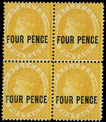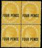 1882-84 4d yellow, type 3 surcharge, wmk CA, perf 14, block of 4, brilliant large part o.g. (lower pair unmounted). A rare and lovely multiple, in exceptional condition. Ex Jaffe. SG 27