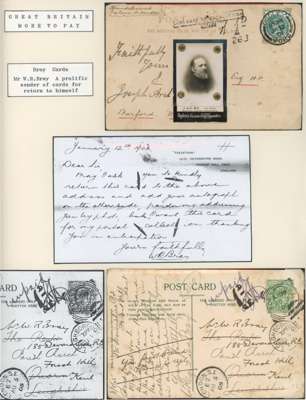 1901-05 pair of W. Reginald Bray postcards franked by ½d and tied by Dudley cds for JA 12 and Forest Hill squared circle for AU 3 with the former bearing a cigarette card depicting Joseph Arch MP and asking for his autograph, being returned to Bray signed and bearing a ‘1d’ charge mark and ‘Contrary to Regulations' instructional mark, paired with a postcard sent by Bray to The Rector of the Parish Church in Quorn depicting Quorn Church and returned with information about the recipient, name of the church, and bells filled out by the vicar with a ‘1d’ charge mark. An attractive and desirable pair (2)