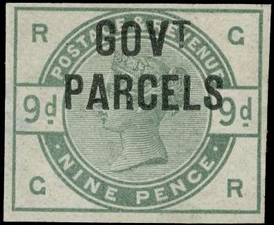 GOVERNMENT PARCELS: 1883 9d dull green (GR), imperforate imprimatur, fine large part og. A scarce stamp with one of only 29 possible examples. SG O63var