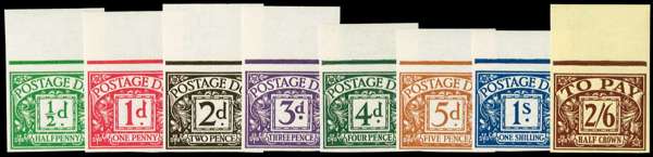 1936-37 ½d-2s6d Postage Due Imprimaturs. Very fine unmounted o.g. set of eight imperforate top marginal imprimaturs, handstamped “NPM IMPRIMATUR“ on reverse. Very rare, one of only seventeen sets released from the NPM archive.