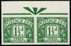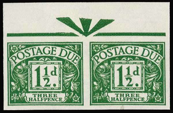 Postage Dues. 1960 1½d green (watermark St Edward's Crown, cream paper). Superb unmounted o.g. top marginal horizontal pair of imperforate imprimaturs each with a "BPMA" handstamp on reverse, showing central sheet dividing arrow in margin. Scarce.