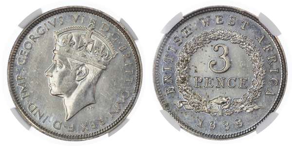 British West Africa. George VI Ni Threepence. 1938KN. GEORGIVS VI D·G·BRITT·OMN·REX·F·D·IND·IMP:, PM below bust left / BRITISH WEST AFRICA, date below, denomination centre of wreath, K.N. above date. KM 21. 5.10g, 21.45mm, 12h.
