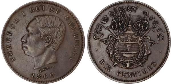 Cambodia. Noorodom I CU 10 Centimes. 1860. NORODOM I ROI DU CAMBODGE, C.WURDEN, date below bust left / · DIX CENTIMES ·, C.WURDEN, Coat of Arms of Kingdom of Cambodia. KM 43. 10g, 30mm, 6h.
