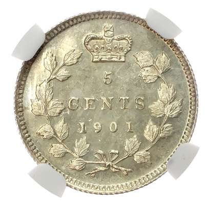 Canada, British Colonial. Victoria AR 5 Cents. 1901. VICTORIA DEI GRATIA REGINA. CANADA below bust left / denomination and date within crowned wreath. KM 2. 1.18g, 15.49mm, 6h. NGC Graded MS 64. Scarce.