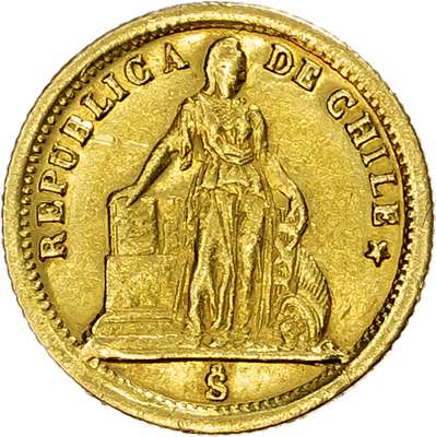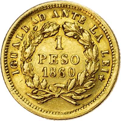 Chile. Santiago AV 1 Peso. 1860 So. REPUBLICA DE CHILE, oS in exergue, standing Liberty / IGUALDAD ANTE LA LEI denomination and date centre in wreath. 1.52g, 14.00mm, 6h.