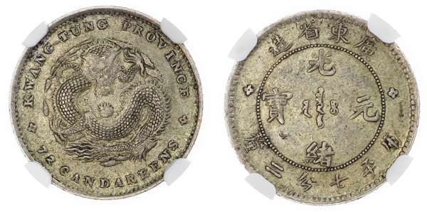 China. Kwang Tung Province AR 10 Cents. 1890-1908. Four Chinese ideograms read top to bottom, right left with Manchu characters in the centre, all surrounded by more Chinese ideogramS / KWANG-TUNG PROVINCE, 7.2 CANDAREENS, Dragon centre. L&M-136, KM Y200. 2.70g, 19.00mm, 12h.