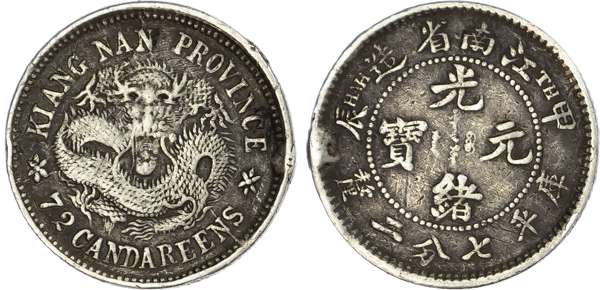 China, Qing Dynasty. Guangxu Emperor AR 7.2 Cancareens (10 Cents). Kiangnan Province, Nanking mint, CD (1904)-HAH TH. Four Chinese ideograms read top to bottom, right to left with Manchu characters in the centre, all surrounded by more Chinese ideograms and mint official's initials; translates as province, emperor and denomination / Flying Imperial dragon facing; ✶ KIANG NAN PROVINCE ✶ above, 7.2 CANDAREENS below. KM Y#142a.13; LM 261. 2.75g, 19mm, 12h.