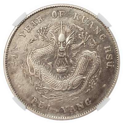 China. Chihli Province AR Dragon Dollar. YR34 (1908). 34th YEAR OF KUANG HSU . PEI YANG . Dragon facing / Chinese characters and ideograms around centre circle with more characters in Chinese, Mongolian / Manchu L&M: 465, KM Y73. 26.70g, 39.00mm, 12h.