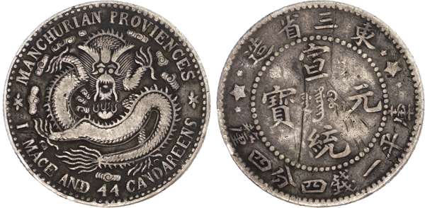 China. Manchurian Provinces AR 20 Cents. ND (1910). Chinese characters with rosettes around outer edge, 5 characters centre / 1st YEAR OF HSUAN TUNG, ❉ MANCHURIAN PROVINCES ❉ dragon facing centre. KM Y213. 5.20g, 24mm, 12h.