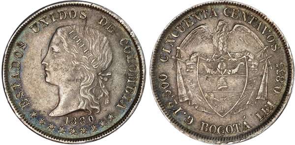 Colombia, United Staes of. Bogota AG 50 Centavos. 1880.