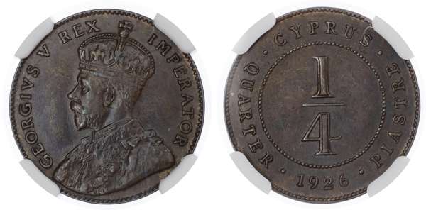 Cyprus, British Administration. George V CU 1/4 Piastre. 1926. GEORGIVS V REX IMPERATOR, B.M. below bust left / • CYPRUS • QUARTER • date • PIASTRE, denomination in centre. KM 16. 2.91g, 21mm, 12h.