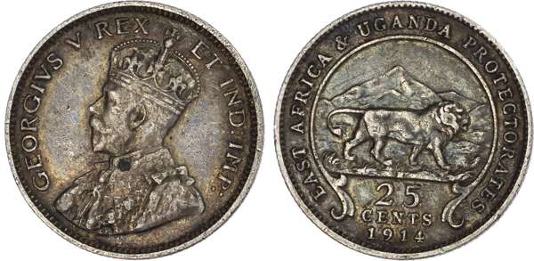 East Africa,, British Colonial. George V AR 25 Cents. 1914H. GEORGIVS V REX ET IND:IMP:, B.M. below bust left / EAST AFRICA & UGANDA PROTECTORATES, denomination and date below Lion walking to right with mountains in the background. KM 10. 2.92g, 17.90mm,, 12h.