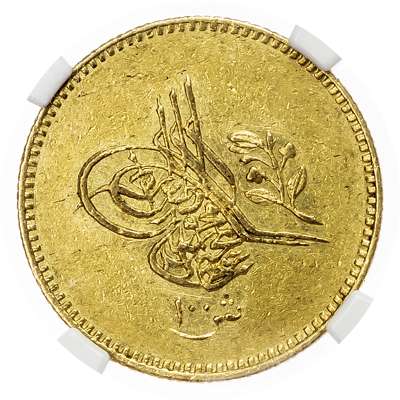 Egypt. Abdulmejid I AV 100 Qirsh. AH1255//17. (1857). Toughra with flower right, denomination in arabic below / year, arabic text and date. KM 235. 8.544g, 21mm, 12h. NGC Graded AU 55. Light lustre.