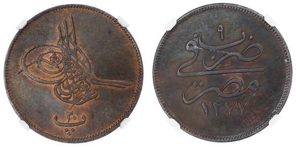 Egypt, Ottoman Empire. Abdulaziz Æ 20 Para. Dated AH 1277 and RY 9 = AD 1868.