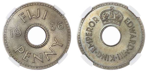 Fiji, British Commonwealth. Edward VIII Cu Ni Penny. 1936. FIJI PENNY, date divided by central hole / EDWARD•VIII•KING•EMPORER, crown, centre hole. KM 6. 6.50g, 26.00mm, 12h.