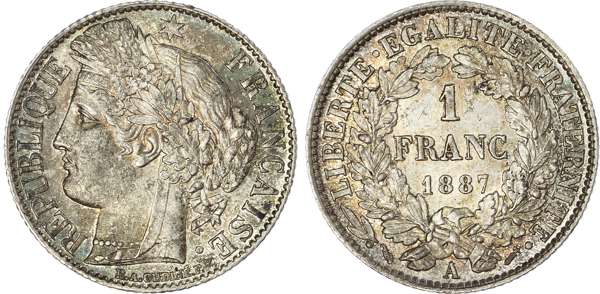 France, Third Republic AR Franc. Paris mint, 1887A.
