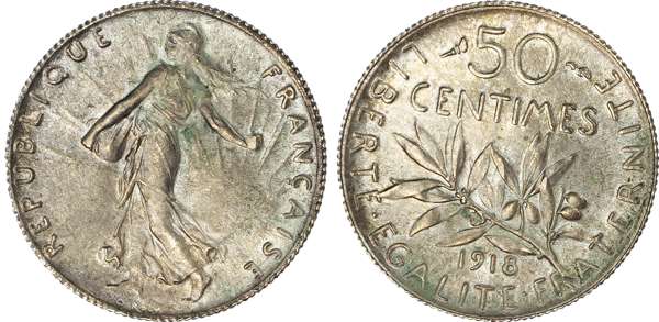 France. Third Republic AR lot of 3 x 50 Centimes. 1918. REPUBLIQUE FRANÇAISE, O.ROTY below figure sowing seeds / LIBERTE·EGALITE·FRATERNITE, denomination above olive sprigs with date below. KM 854. 2.50g, 18.20mm, 6h.