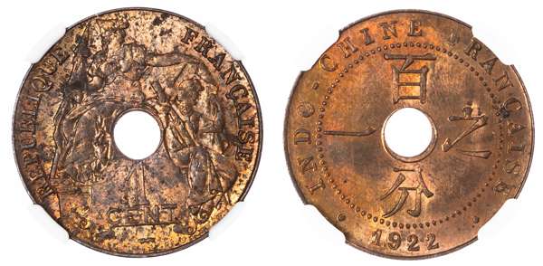 French Indochina Æ Cent. Poissy mint, 1922. Obverse die by Jean-Baptiste-Daniel Dupuis. REPUBLIQUE FRANÇAISE, two female allegories representing France and Indochina seated facing each other on a pedestal; denomination on pedestal, thunderbolt (mintmark) and DANIEL DUPUIS below / • INDO-CHINE FRANÇAISE •, four Chinese characters around central hole; date below. KM 12.3.