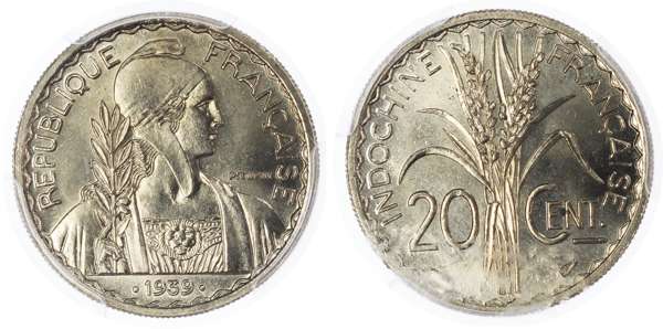 French Indochina, Third Republic CU-NI 20 Centimes. Paris, 1939. REPUBLIQUE FRANÇAISE, Marianne facing right, holding laurel branch; P.TURIN (engraver) to right, denomination below / INDOCHINE FRANÇAISE, rice plant; denomination across fields. KM 23a.1.