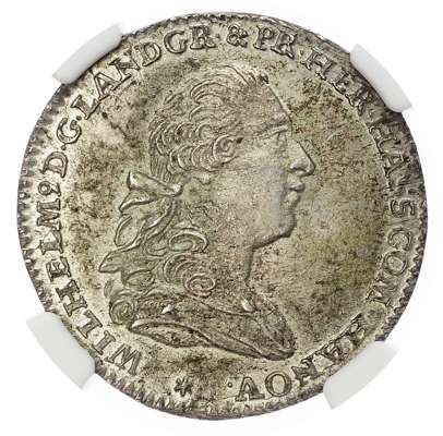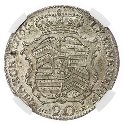 Germany, States, Hanau-Munzenberg. William IX AR 20 Kreuzer. 1766 IIE. WILHELM9 D•G•LANDGR.&PR•HER•HASS•COM•HANOV. ✶ bust right / LX. EINE FEINE MARCK Aodate, denomination and mm below Crowned Coat of Arms. KM 97.2. 6.59g, 12h. NGC Graded MS 63. Top Pop. Extremely Rare.