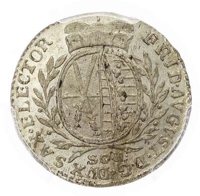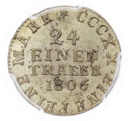 Germany, States. Saxony Bi 1/24 Thaler. 1806 SGH. CCCX X: EINE FEINE MARCK, 24 EINEN THALER, date below in centre / CCCX X: EINE FEINE MARCK around crowned Coat of Arms. KM 968. 1.98g, 20mm,, 12h. PCGS Graded MS 65. Top Pop. Scarce.