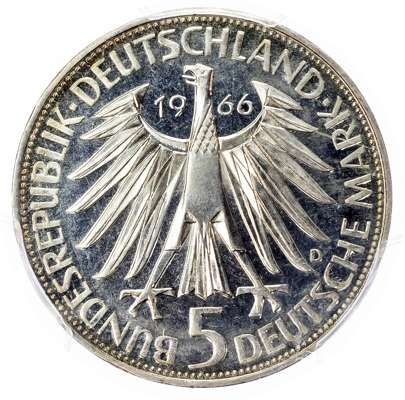 Germany, Federal Republic. Wilhelm Leibniz AR Proof 5 Marks. 1966D. BUNDESREPUBLIK · DEUTSCHLAND ·, 5 DEUTSCHE MARK. D below stialized eagle / GOTTFRIED · WILHELM · LEIBNIZ, dates below bust facing. KM 119. 11.20g, 29mm, 12h. PCGS Graded PR 67 Cameo. One of the finest available..