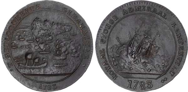 Gibraltar, British Overseas Territory. Blockade of Gibraltar Æ Medal. Made in the Netherlands. 1783. 'T GEBLOQUEERDE GIBARALTAR ★, rock of Gibraltar with naval battle; date below / ROYAAL GEORGE ADMIRAAL KEMPENFELT, ship sinking; date below. Eimer 800. 10.23g, 33mm, 6h.