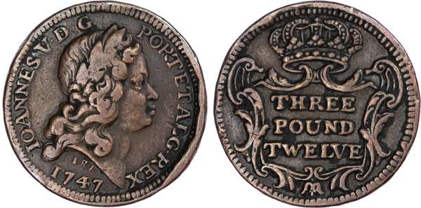 Great Britain. George II Æ Gold Weight, for Joao V Portuguese gold. 1747. IOANNES V. D. G. PORT ET ALG. REX, IPI, date below bust right / THREE POUND TWELVE, crown over ornate shield. Edge- I.KIRKE, LONDON. 28.40g, 27.00mm, 12h. Thick Planchet.