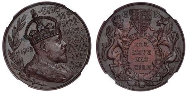 Great Britain. Edward VII Æ Coronation Medallion. 1902. EDWARD VII ❉ KING OF GREAT BRITAIN & IRE-LAND• EMPER-OR OF INDIA ✻ date behind bust right with floral sprays on truncation / GOD SAVE THE KING, HO SOIT • QUI • MAL • Y • PENSE •, DIEU ET MON on banners, E R divided above by Royal crest, Lion and Unicorn flank. BHM Rev; 3797. 38mm, 12h.