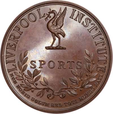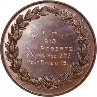 Great Britain. George V Æ Boxed Sports Medallion. 1913. LIVERPOOL INSTITUTE SPORTS, NON NOBIS SOLUM SED TOTI MUNDO NATI, Liver bird above, wreath below / (engraved) L.I.S.C. date, S.H.ROBERTS, 25 YDS. HOC. 2ND. NEAT DIVE. U. 15. within wreath. In original plush bx of issue. 40.23g, 42.00mm, 12h.