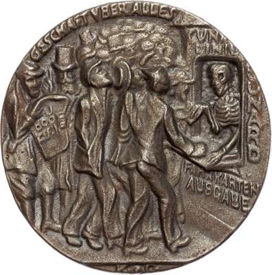 Great Britain. George V Æ Medallion, for the sinking of the WWI ship Lusitania. 1915. GESCHAFT VBERALLES, CUNARD LINES, FAHRKARTEN AUSGABE, K.G. crowds of passengers waiting to get tickets served by death (skeleton) / KEINE BANN WAREN, DER GROSSDAMPFER =LUSITANIA= DURCH EIN DEUTSCHES TAVO BOOT VEPSENKT 5 MAY 1915, image of the stricken boat going below the waves. By Karl Goetz. 64.25g, 55.00mm, 12h.