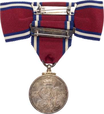 Great Britain. George V AR Ladies Coronation Dress Medal. 1935. GEORGE.V.AND.QUEEN.MARY MAY.IV.MCMXXXV, conjoined busts in royal regalia centre / Dates flanking GRJ monogram with crown above. Suspended for wear by ladies attending the Coronation. In original box of issue.