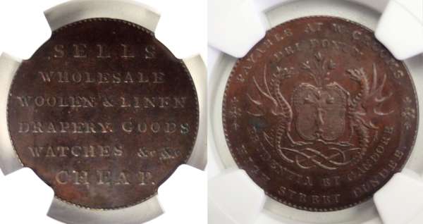 Great Britain, Angusshire. Dundee CU Halfpenny Token. Circa 1790. ❉ PAYABLE AT W. CROOMS. ❉HIGH STREET DUNDEE, DEI DONUM, PRUDENTIA ET CANDORE, crest centre / SELLS WHOLESALE WOOLEN & LINEN DRAPERY GOODS WATCHES & & CHEAP. D&H 12. 6h.