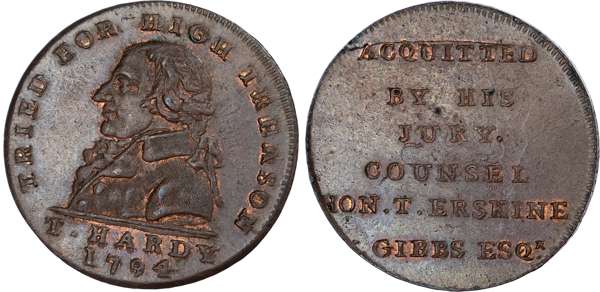 Great Britain, Middlesex. T Hardy CU Halfpenny Token. 1794. TRIED FOR HIGH TREASON, T.HARDY, date below, bust left centre / AQUITTED BY HIS JURY COUNSEL ON T. ERSKINE GIBBS ESQ. National Series. D&H 1024.8. 7.98g, 28.00mm, 6h.
