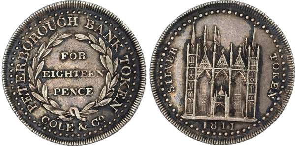 Great Britain, temp. Hanover. Peterborough Bank AR 18 Pence Token. 1811. View of Peterborough Cathedral; SILVER TOKEN to left and right, date below; all within pelleted border / PETERBOROUGH BANK TOKEN, FOR EIGHTEEN PENCE within laurel wreath; COLE & CO. below; all within pelleted border. D&H 3. 5.76g, 27mm, 12h.