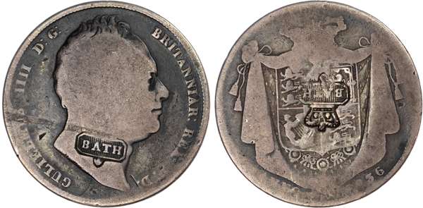 Great Britain, Hanover. William IV AR Counterstamped 1/2 Crown. 1836. Dies by William Wyon and Jean Baptiste Merlen. GULIELMUS IIII D: G: BRITANNIAR: REX F: D:, bare head to right; incuse W. W. on truncation; c/m: BATH in rectangular incuse / Crowned and mantled coat of arms; date below; c/m: crown above BATH in rectangular incuse. SCBC 3834; KM 714.2. 12.57g, 32mm, 6h.