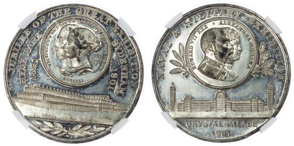 Great Britain. Victoria WM Medallion, Naval & Military Exposition. 1901. NAVAL & MILITARY EXHIBITION, CRYSTAL PALACE, date below in exergue, scene of the Palav=ce, conjoined busts of Edward VII & Princess Alexandria flanked in circle with laurel & oak / JUBILEE OF THE GREAT EXHIBITION, HYDE PARK, SYDENHAM, 1851 - 1901, conjoined busts of Victoria & Albert, Crystal Palace below, with laurel leaves in exergue. BHM-3734. 38.00mm, 12h.