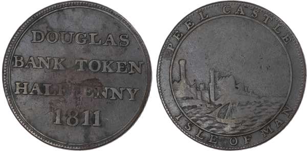 Isle of Man, Douglas. George III CU Halfpenny Token, Peel Castle. 1811. DOUGLAS BANK TOKEN HALFPENNY date in four lines / Scene of Peel Castle with ship on sea in foreground; PEEL CASTLE above, ISLE OF MAN below. Withers 2061. 6.38g, 25mm, 12h.