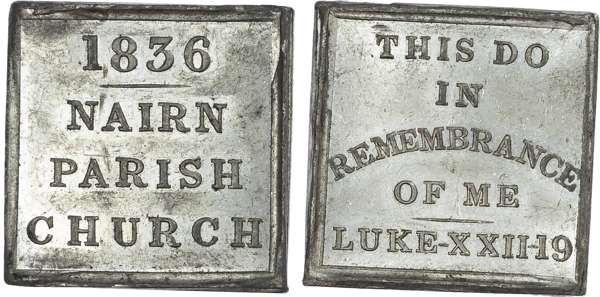 Scotland. Nairn Parish Church Pewter Communion Token. 1836. Date - NAIRN PARISH CHURCH in three lines / THIS DO IN REMEMBRANCE OF ME- LUKE- XXII.19. Square planchet. 5.98g, 24mm, 12h.