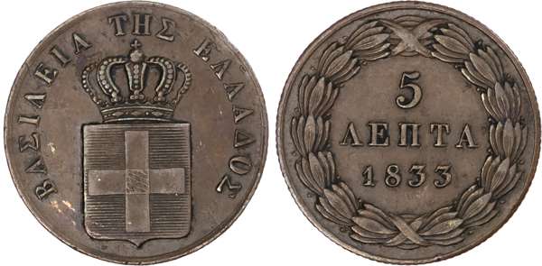Greece, Kingdom. Otto CU 5 Lepta. Munich mint, 1833. Dies by G. Voigt. ΒΑΣΙΛΕΙΑ ΤΗΣ ΕΛΛΑΔΟΣ over crowned coat-of-arms / Denomination and date within wreath. KM 16; Hellas 55. 6.49g, 25mm, 12h.