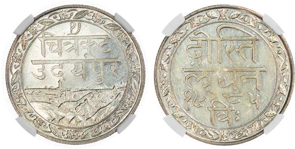 India, Mewar (Princely State). Fatteh Singh AR Rupee. Calcutta mint, VS 1985 = 1928. Countryside scene with ornate border; legend in Devanagari above / Devanagari legend in four lines translating as 'Dosthi (Friendship)(with) Londhon (London) and date'. KM Y22.1 (thin legend).