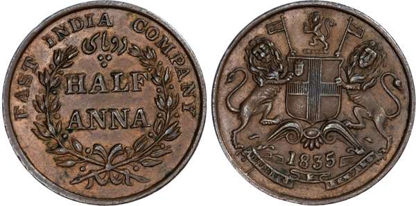 India, British Colonial. William IV East India Company CU Half Anna. 1835.