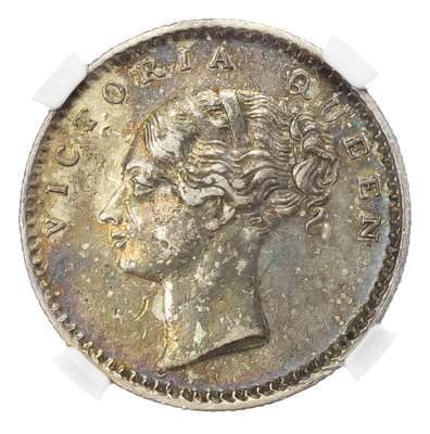 India, British Colonial. Victoria AR ¼ Rupee. 1840(B). VICTORIA QUEEN bust left / EAST INDIA COMPANY, denomination, چار آنہ, date below, wreath centre. KM 453. 2.92g, 19.50mm, 12h.
