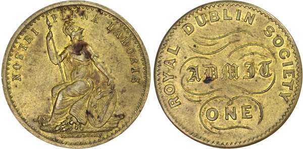 Ireland. .BR Royal Dublin Society Pass. Circa 1820-1890. NOSTRI PLANA LABORIS, PARKES DUBLIN, below seated Britannia / ROYAL DUBLIN SOCIETY, ADMIT ONE. Davis & Walters: 123/175. 12.65g, 35.00mm, 12h.
